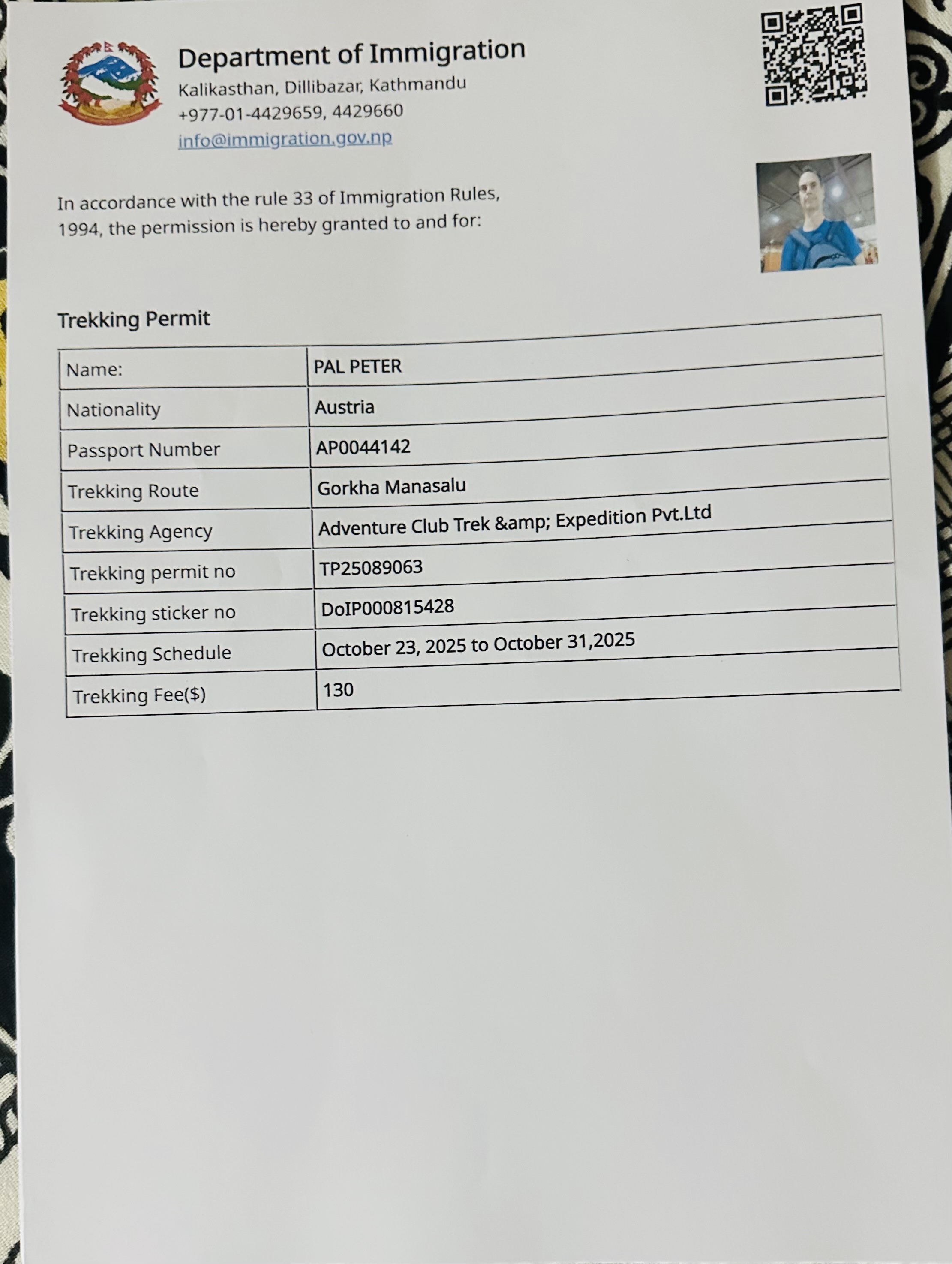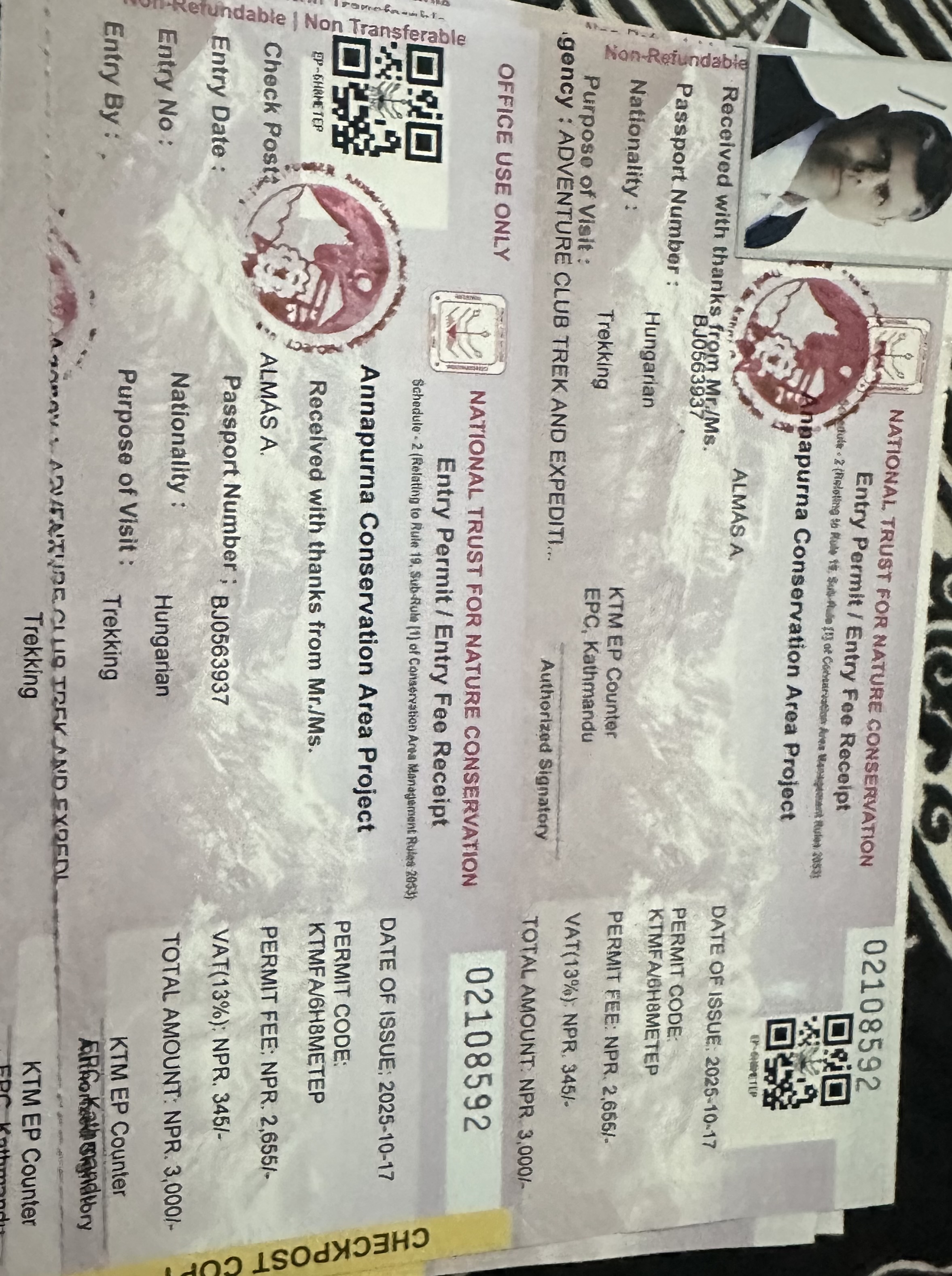 The original passport and valid Nepal visa are required to issue the permits, and the permits are non-transferable and non-refundable once issued.
