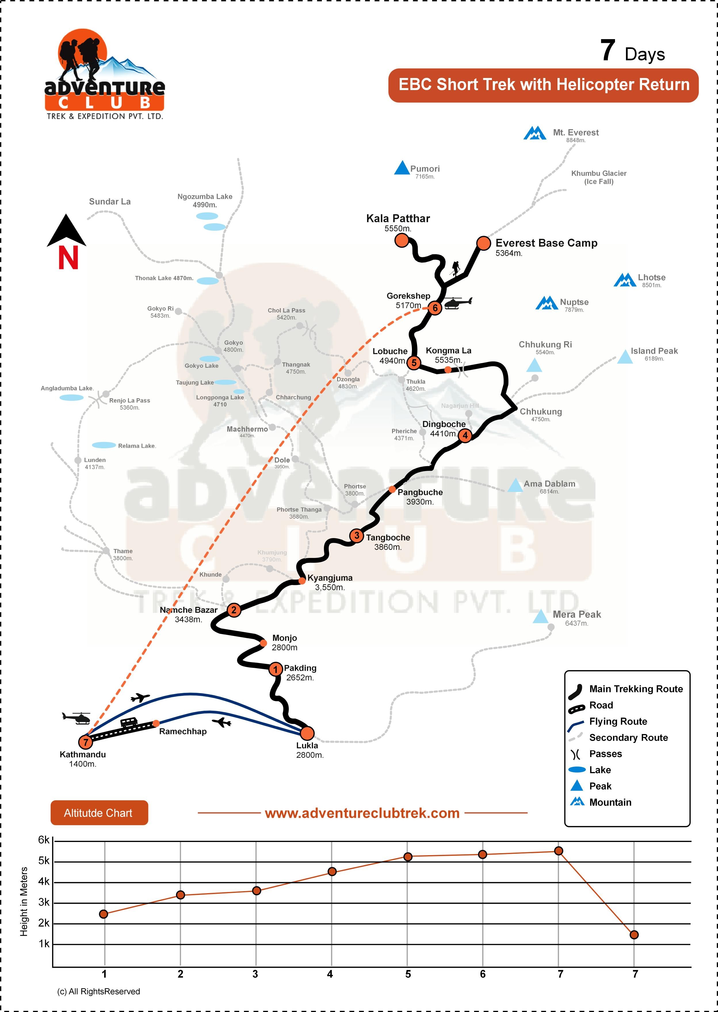 The Everest Base Camp Trek with Helicopter Return—7 Days is considered moderately challenging and suitable for trekkers with a good level of fitness. Unlike the longer classic route, this itinerary involves trekking only up to Namche Bazaar (3,440 m), followed by an exciting helicopter flight to Everest Base Camp (5,364 m) with a landing at Kala Patthar (5,545 m) for breathtaking close-up views of Mount Everest. The trail includes some uphill and downhill walking, but it is well-paced and manageable for most people. The shorter duration minimizes physical strain while offering the same incredible Himalayan experience, stunning landscapes, and Sherpa culture. However, proper preparation and acclimatization are still essential to ensure a safe and enjoyable journey in the high-altitude environment.