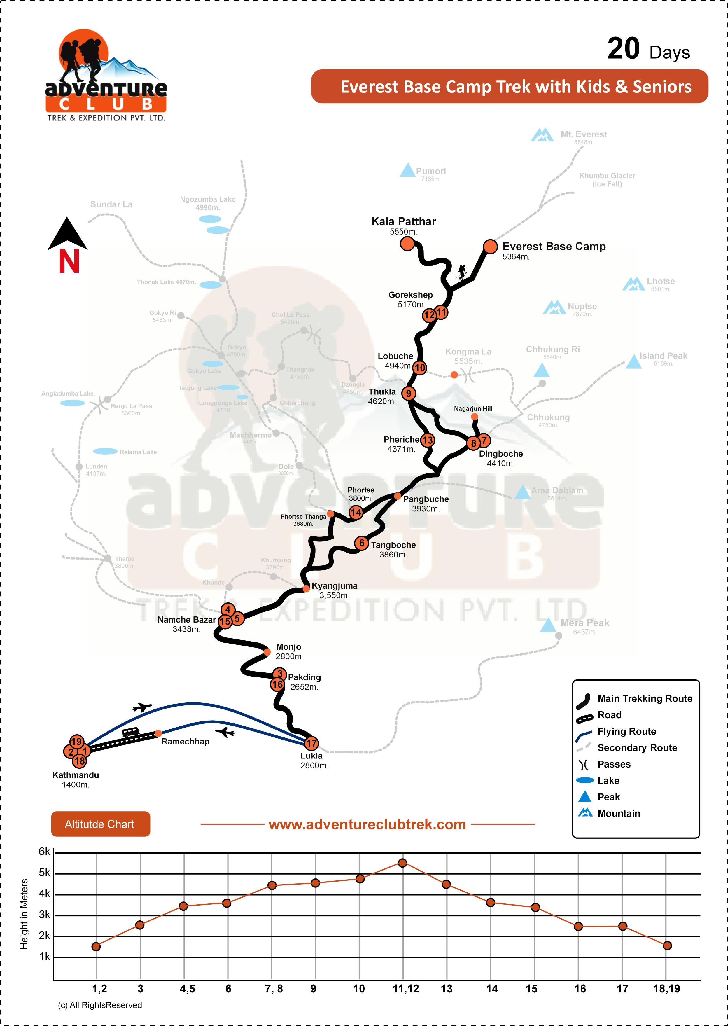 Everest Base Camp Trek is a moderate trek suitable for passionate walkers who can walk at least 5-6 hours a day with a light rucksack. On some days, we might even need to walk for 7 to 8 hours. Walking in higher altitudes is more physically demanding than walking in the lower altitudes; however, if we are in excellent health with average physical fitness, have a positive attitude, and strong determination, we can accomplish the trek. Exercising and jogging regularly is a good idea to enhance our strength and stability. Past hiking experience would be an asset, but no technical skill is required for this trip. Participants with pre-existing medical conditions such as heart, lung, and blood diseases should inform Adventure Club Trek before booking the trek. We also recommend that you consult your doctor(s) before the trip.