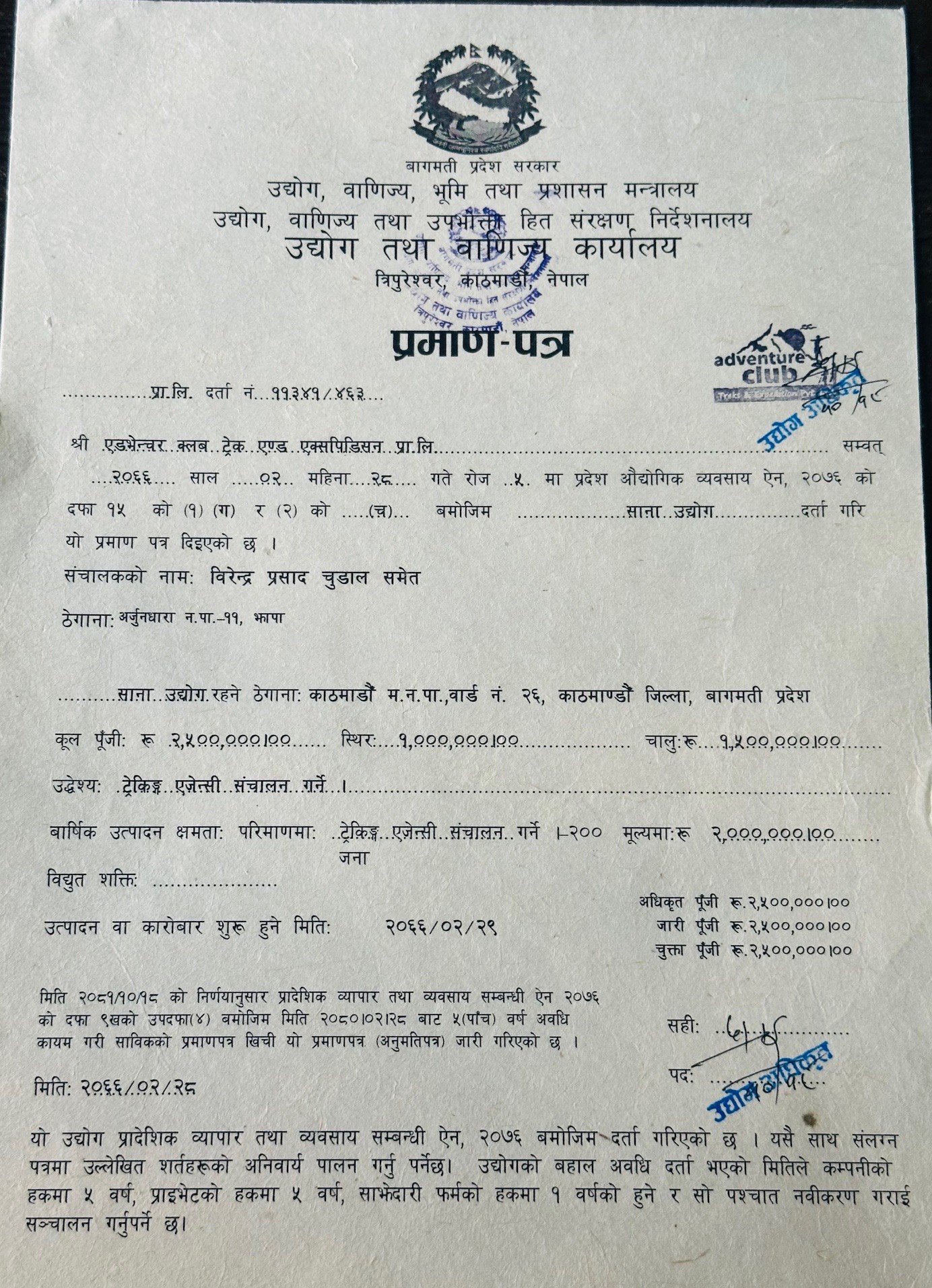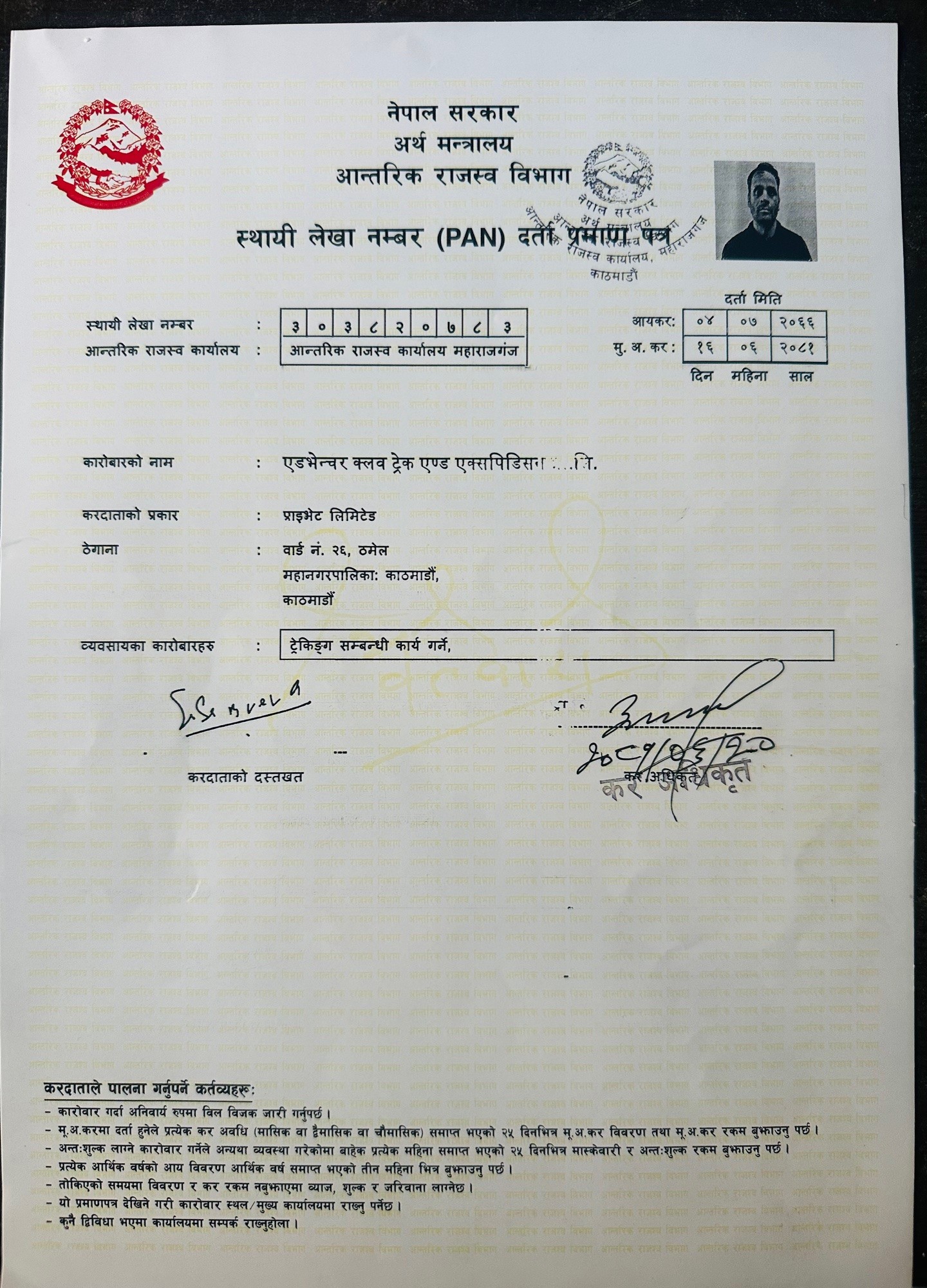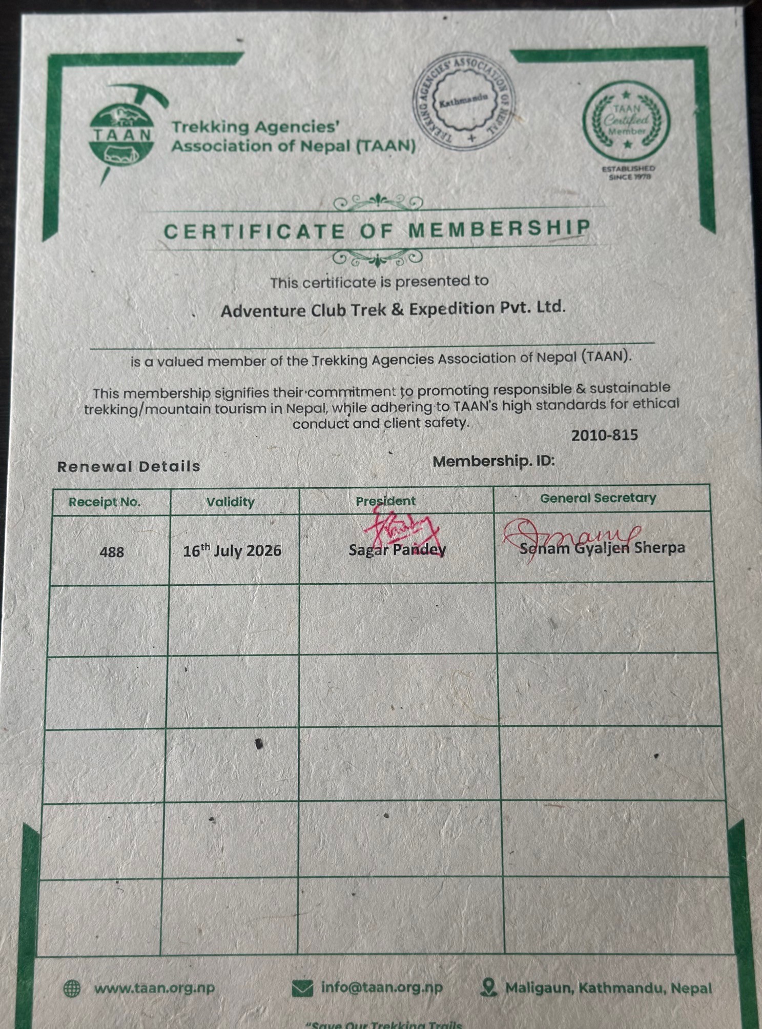 Adventure Club Trek is a government-registered travel and trek company. We are registered at the Company Registration Office and authorized by the Nepal Tourism Board and Industry Department. The Nepal Government Tourism and Civil Aviation Department, the Taxation Office, Nepal National Bank's foreign exchange department, and affiliated with other sister concern associations, Trekking Agent Association of Nepal (TAAN), the Mountaineering Association (NMA), and other government-associated agencies.
